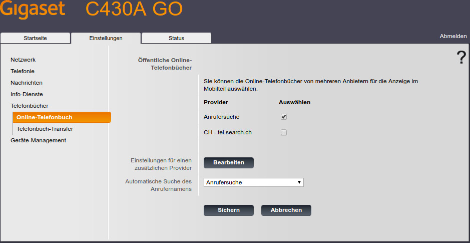 Auswählensetzen und über den ButtonSichernbestätigen. Anschließend diesen Eintrag bei Automatische Suche des Anrufernamens auswählen und nochmals mitSichernübernehmen.